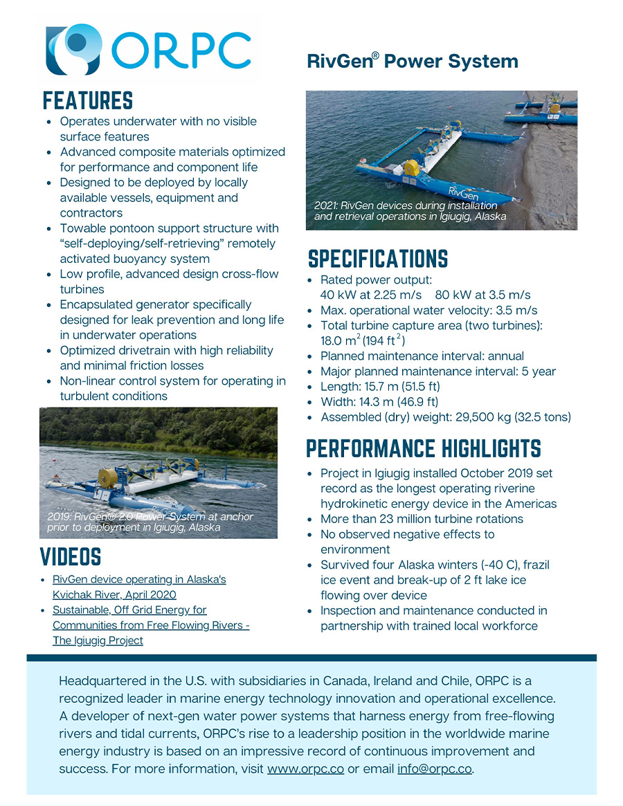 ORPC’s RivGen Power System project in collaboration with the Village of Igiugig, Alaska, features the longest operating marine energy project in all of the Americas. Many communities like Igiugig find their economies restricted by lack of access to affordable energy. ORPC offers communities control over their energy future, a sustainable source of locally-produced, renewable power, and the resulting economic benefits.